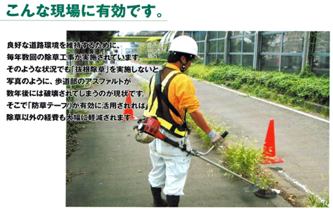 これまでは、人力除草を行っていましたが、毎年数回の除草作業が必要であり、アスファルトが破壊されるなど、除草以外の経費もかかっていました。防草テープを施工する事で、多くは(機械刈りが困難で)手作業に頼っている箇所の除草が長期に亘って軽減出来ます。
