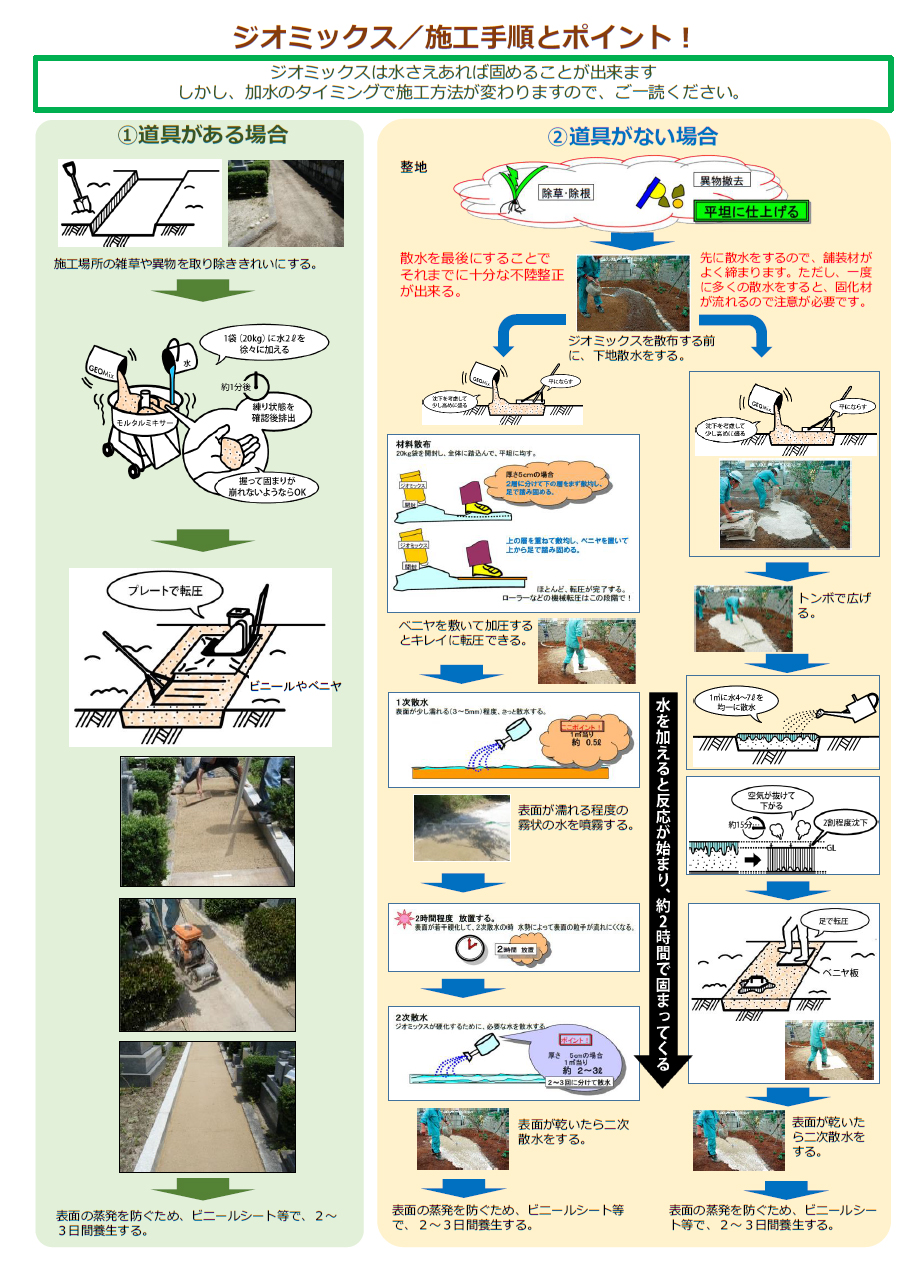 墓苑・墓地はできるだけ土系舗装で、お墓の防草も土系舗装で!こういった多くのお客様からの要望で、酸化マグネシウム系固化材「ジオベスト」で、防草を目的とした土系舗装、個々のお客様の要望で、酸化マグネシウム系真砂土舗装材「ジオミックス」でお墓の防草を行っています。下の写真は墓苑・墓地全体の通路を、ジオベスト20kgと真砂土を混ぜて施工しました。墓苑・墓地はかなり広いので、3年計画で土系舗装を行いました。場所は大阪です。個々のお墓の防草は、ジオベストと真砂土を混ぜたプレミックス商品「ジオミックス」で防草目的の土系舗装を行います。ジオミックス20kg入り2袋で1㎡の施工ができますので、ジオベストより無駄がありません。水を撒くだけの簡単施工です。ご自分でやるのは難しいと思われている方には、プロが対応させていただきます。・お問い合わせは、いけじり(TEL.0120-015-191)まで。ジオミックスの標準品のご注文は下記よりお願いします。いけじりホームページ■ジオミックスの特注品のお問い合わせはジオサプライ合同会社 ホームページ☎ 広島082-299-0681 神戸078-843-2561 名古屋052-766-6419 福岡092-518-3537