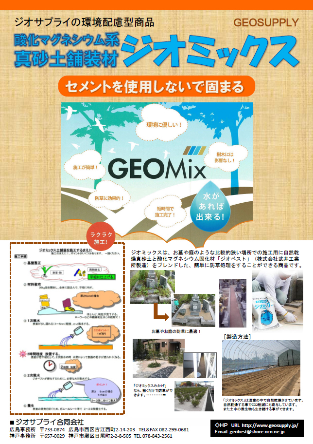 真砂土舗装材「ジオミックス」の材料となるのが、酸化マグネシウム系土舗装固化材「ジオベスト」です。ジオベストは、セメント系固化材、石灰系固化材と同じ土系舗装に使用する固化材ですが、主原料に酸化マグネシウムを使用しているという違いです。 よって、どの固化材を使用しても真砂土とブレンドした真砂土舗装材=プレミックス製品を作ることができます。 酸化マグネシウム系固化材は一番後発ですが、実は古くからセメントの代わりとして使用されていました。よって歴史は古いのですが、土系舗装材として改良し、新しい配合で開発して脚光を浴びたのが最近であるという違いです。 この酸化マグネシウムを主原料とした「ジオベスト」の特徴としては、 ① 弱アルカリ領域で耐久性のある硬化物が生成され、固化します。つまり、自然の土に近いので自然環境に負荷をかけません。 ② 植物の生育に必要な養分を不溶化して、雑草の生育を防止します。除草剤ではありませんので、雑草を枯らす殺草剤ではありませんので、安全です。 ③ 六価クロム等の重金属類を含みません。 ④ 一気に固まらないので、不陸整正がきちんとできます。 ジオミックス標準品は1袋20kgをネット通販で販売しております。 いけじりホームページ