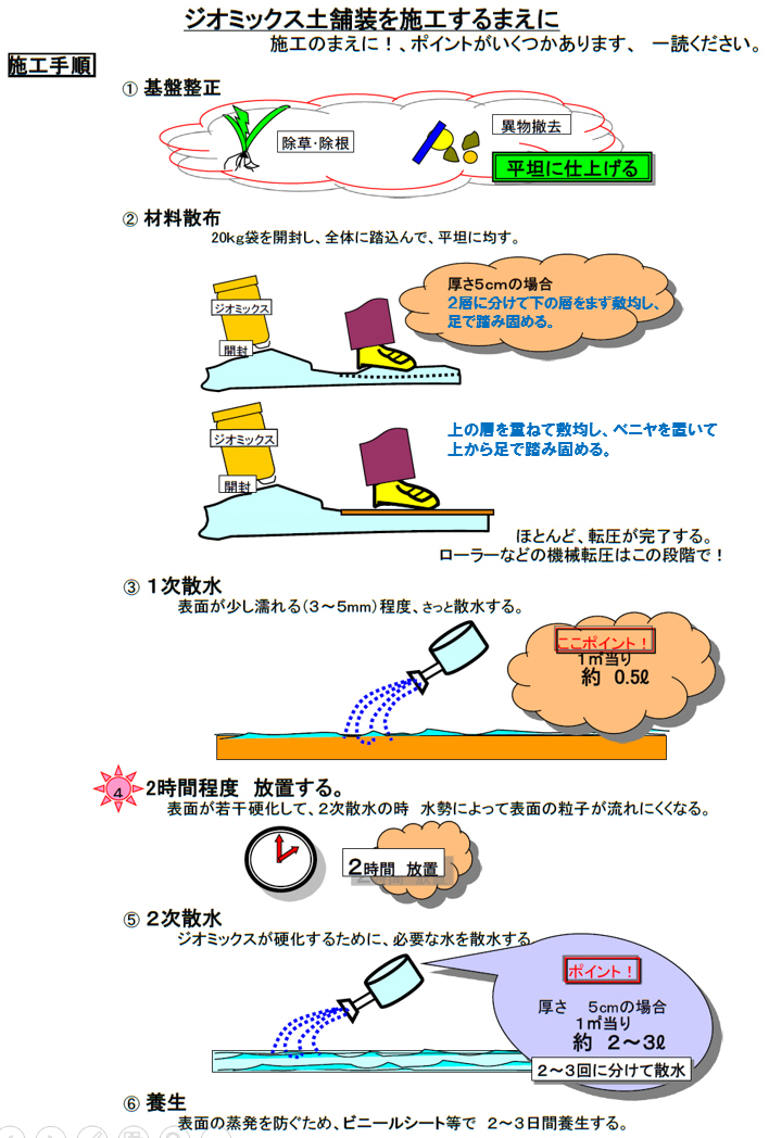 ①場所の確認→②施工場所の下地整正→③敷き均し→⑤転圧→⑥散水→⑥養生
